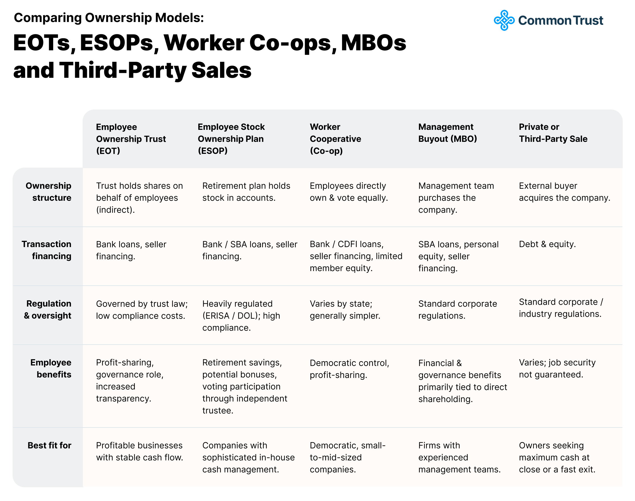 If you’re weighing multiple succession paths, here’s a quick breakdown of how EOTs compare to other ownership models: